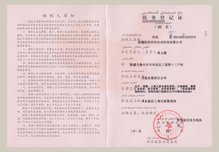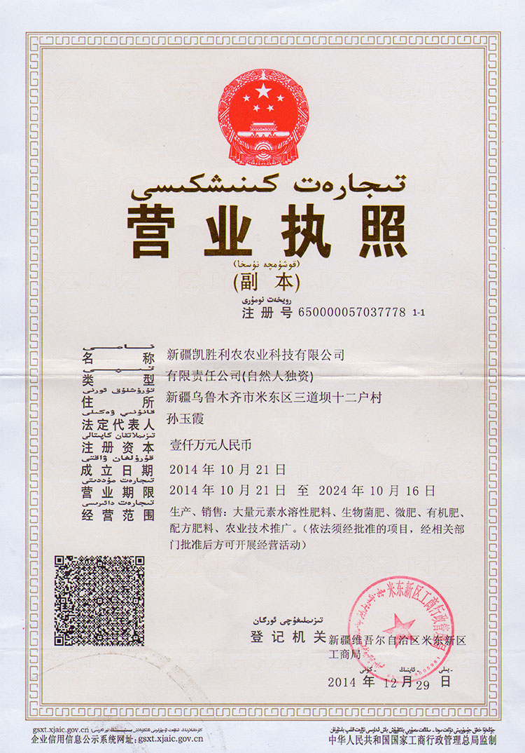 新疆凯胜利农农业科技有限公司由保植专家、肥料专家、生物专家等高技术人员组成研发团队,成功开发出具有自主知识产权的系列产品:稀土有机肥、氨基氮磷组合增效肥、高淳稀土叶面肥、螯和稀土微量元素水溶肥、腐殖酸系列水溶肥、大量元素水溶肥、中微量元素水溶肥等系列生态肥料。
